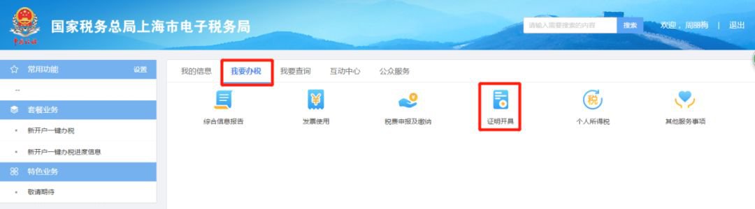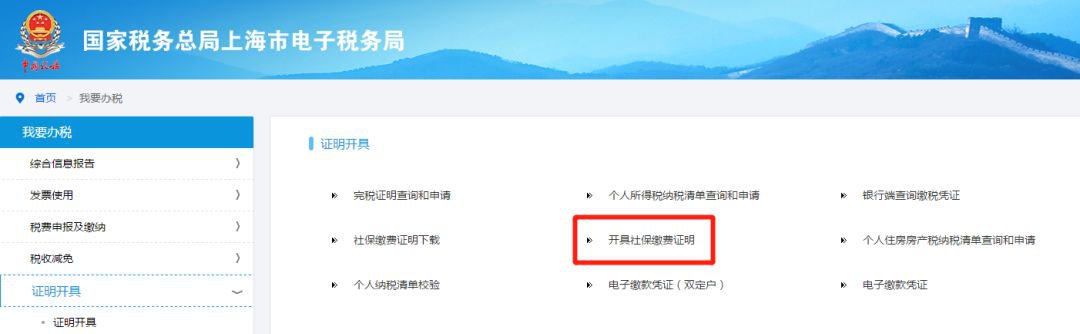 (三)登录后,在首页界面“我要办税”模块中选择“证明开具”,再选择所列选项中的“开具社保缴费证明”;