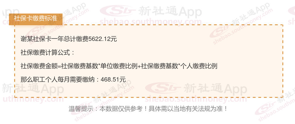 由上图得知,谢某社保卡一年需要缴纳5622.12元,职工个人月缴纳468.51元。