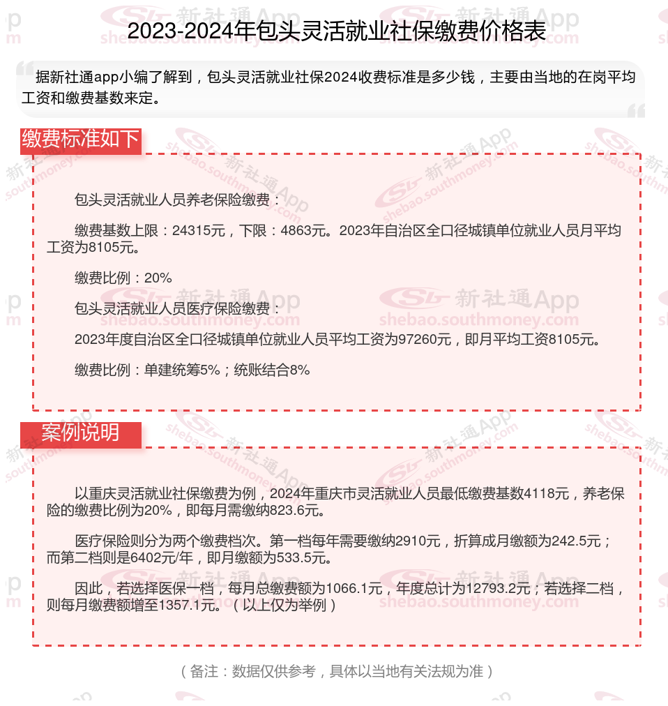 (1)包头灵活就业社保参照职工社保的缴费基数进行缴纳。灵活就业社保由于各地区经济发展水平不一,职工月平均工资存在差异,所以各地区的社保缴费基数上下限也不同。