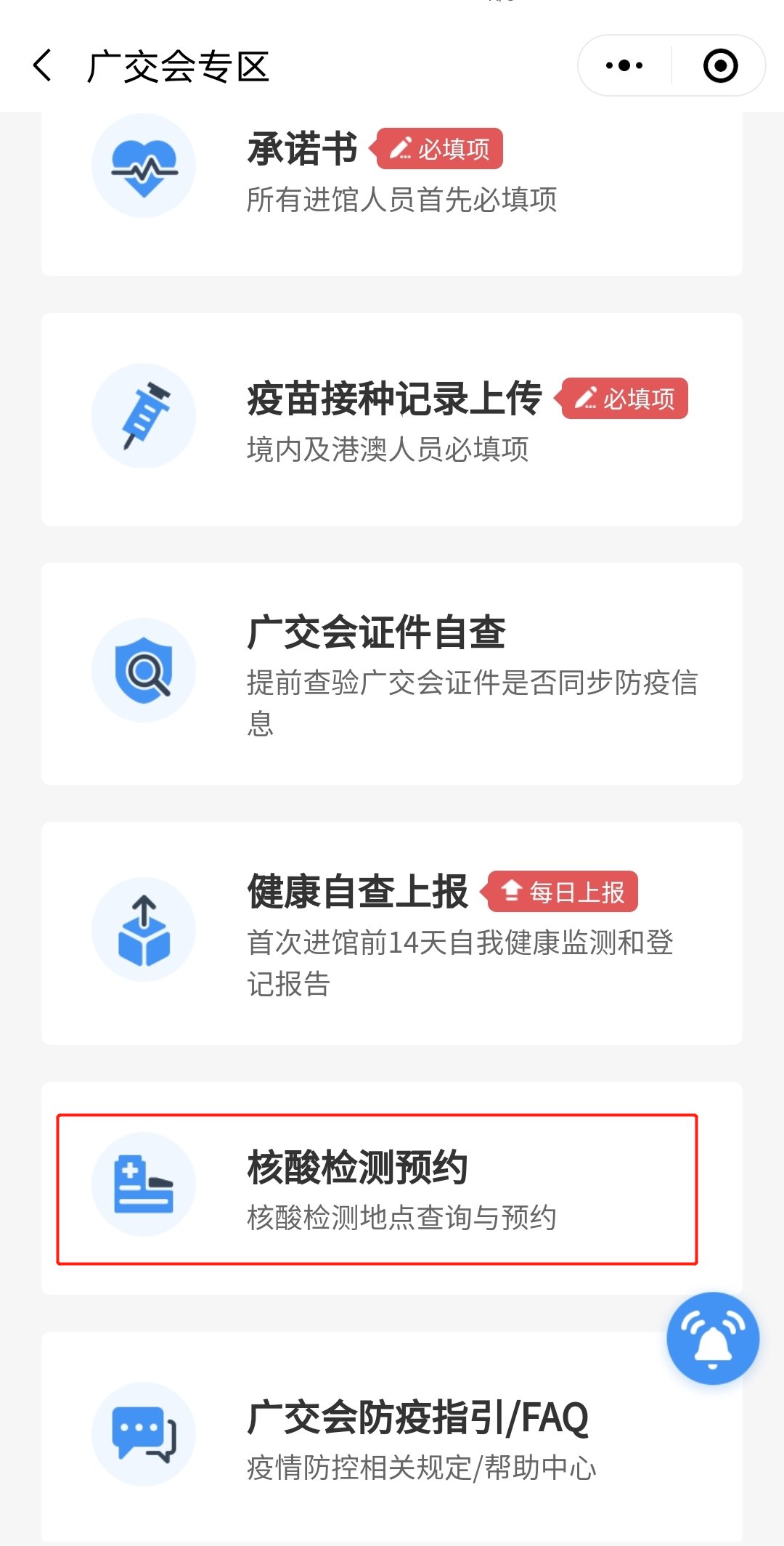 2021年广州广交会将于2021年10月15日-10月19日,参加本次广交会的人员都需要核酸检测证明,广州市内设置多处广交会核酸检测采样点,采样需在“穗康”小程序上提前预约。具体预约如下: